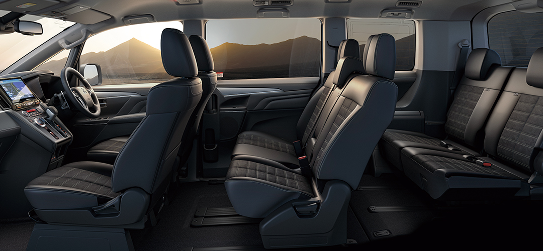 *1 コンビネーションシート(スエード調素材 撥水機能付×合成皮革、カーキステッチ付)は、シートの座面中央部および背もたれ面中央部(除く中央席)はスエード調素材 撥水機能付となり、それ以外は合成皮革となります。 *2 ファブリックシート(スエード調素材×ファブリック)は、シートの座面中央部および背もたれ面中央部(除く中央席)はスエード調素材となり、それ以外はファブリックとなります。 *3 フロントシート、セカンドシートの座面および背もたれ面、サイドサポート部内側、サードシートの座面および背もたれ面中央部に本革を使用しています。 ●ボディカラー、シート色は印刷インキの性質上、実際の色と異なって見える場合があります。ご購入の際には、実車・カラーサンプル等によってご確認ください。